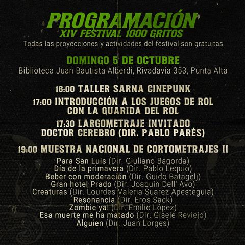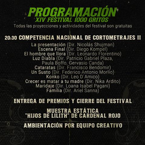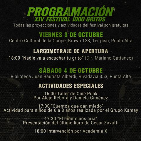 Llega la XIV edición del Festival Nacional de Cine Fantástico y de Terror “1000 Gritos”, el festival, que ya es un clásico en la ciudad, se realizará los días 3, 4 y 5 de Octubre en dos sedes emblemáticas, la Biblioteca Juan Bautista Alberdi, en Rivadavia 353, y el Centro Cultural Cooperativa Obrera de Brown 128.