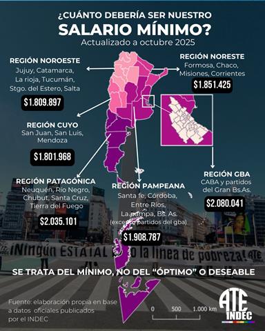 Un trabajador/a necesitó, en el mes de noviembre de 2025, $ 2.080.041.- para satisfacer las necesidades mínimas de un hogar constituido por una pareja de 30 años con dos hijxs en edad escolar. Este valor se compone de $ 711.260.- necesarios para adquirir una canasta alimentaria mínima y de $ 1.368.781.- para acceder a otros bienes y servicios básicos.