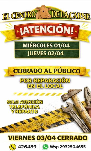 El comercio “El Centro de la Carne” informó que mantendrá sus puertas cerradas al público durante parte de la semana debido a trabajos de reparación …