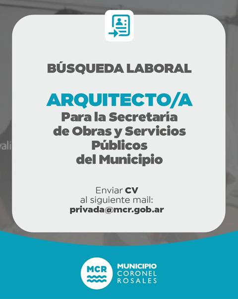 Desde el Municipio local se informa a la comunidad que se esta llevando adelante la búsqueda de Arquitecto/a para sumarse la Secretaría de Obras y …