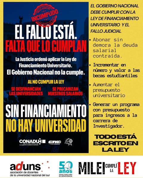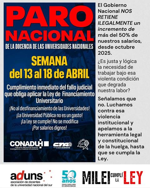 ADUNS comunicó hoy que se decidió extender el paro por otra semana, del 13 al 18 de abril, para exigir que se cumpla con la implementación de la Ley de Financiamiento Universitario.
