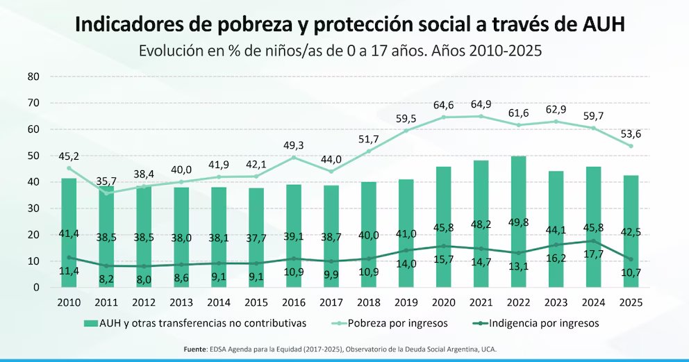 Es que en 2012, la pobreza afectaba al 38,4% de los niños y adolescentes y a partir de allí comenzó un período de deterioro casi ininterrumpido, con un máximo histórico en 2023 (62,9%). La UCA ponderó que el progreso en 2024 y 2025 es significativo pero alertó que «el nivel sigue siendo muy superior al de 2010 y, por supuesto, al de los mejores años de la década pasada».