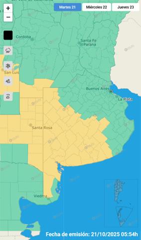 Se prevén valores de precipitación acumulada entre 20 y 50 mm, pudiendo ser superados de manera puntual. Los mayores acumulados se esperan durante el día jueves 23 de octubre.