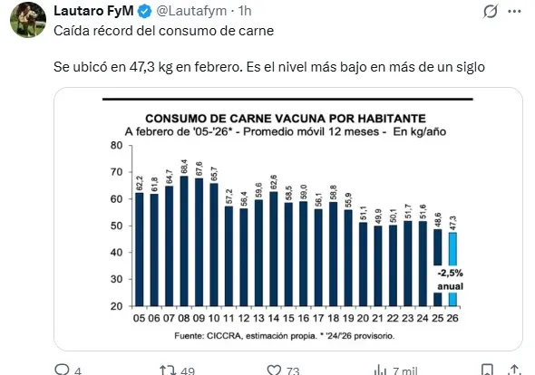 De acuerdo con el último informe de la Cámara de la Industria y Comercio de Carnes y Derivados de la República Argentina (CICCRA), el consumo aparente per cápita se ubicó en 47,3 kilos anuales, lo que representa una caída del 2,5% interanual y el nivel más bajo de los últimos 21 años.