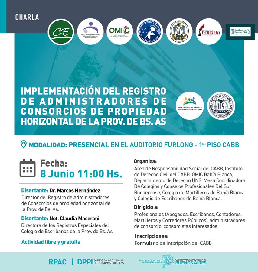 El Colegio de Abogados de Bahía Blanca los invita a participar de la Charla sobre Implementación del Registro de Administradores de Consorcios de propiedad horizontal de la Provincia de Buenos Aires, el próximo jueves 8 de junio en el Auditorio Héctor Furlong (Sarmiento 54 – 1er piso) a las 11.00 Hs.