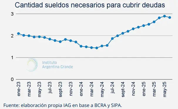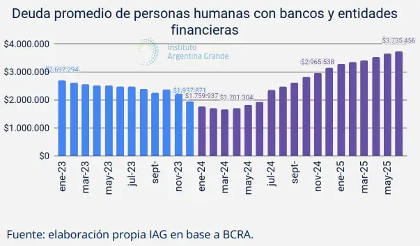 “Un tercio de los argentinos les deben plata a los bancos, y la deuda promedio de las personas endeudadas es de $3,7 millones de pesos”, estimaron desde el IAG. Según los especialistas, la mediana se sitúa en el intervalo de entre $750.000 y $1.000.000; es decir que la mitad de las y los deudores adeudan este monto.