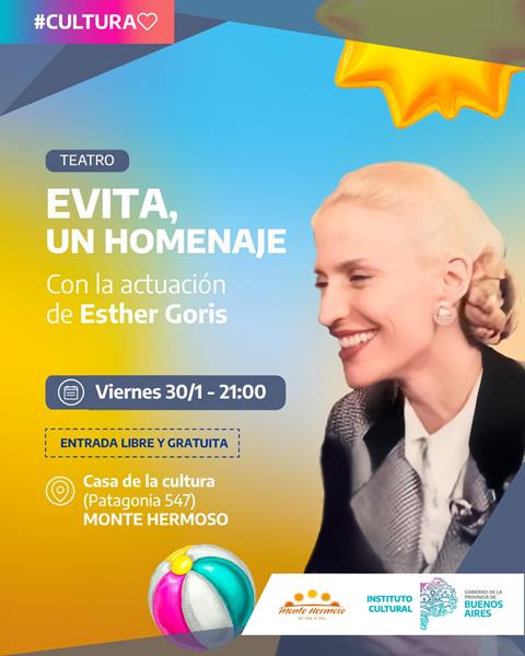 La obra de teatro “Evita, un homenaje” llega este viernes 30 de Enero a la Casa de la Cultura de Monte Hermoso con la destacada actuación de Esther Goris.