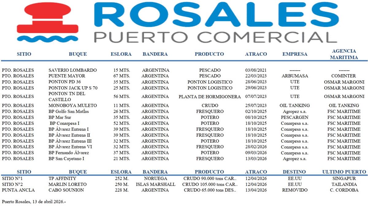 Puerto Rosales, informe de las actividades diarias, suministrado por el Consorcio de Gestión local.
