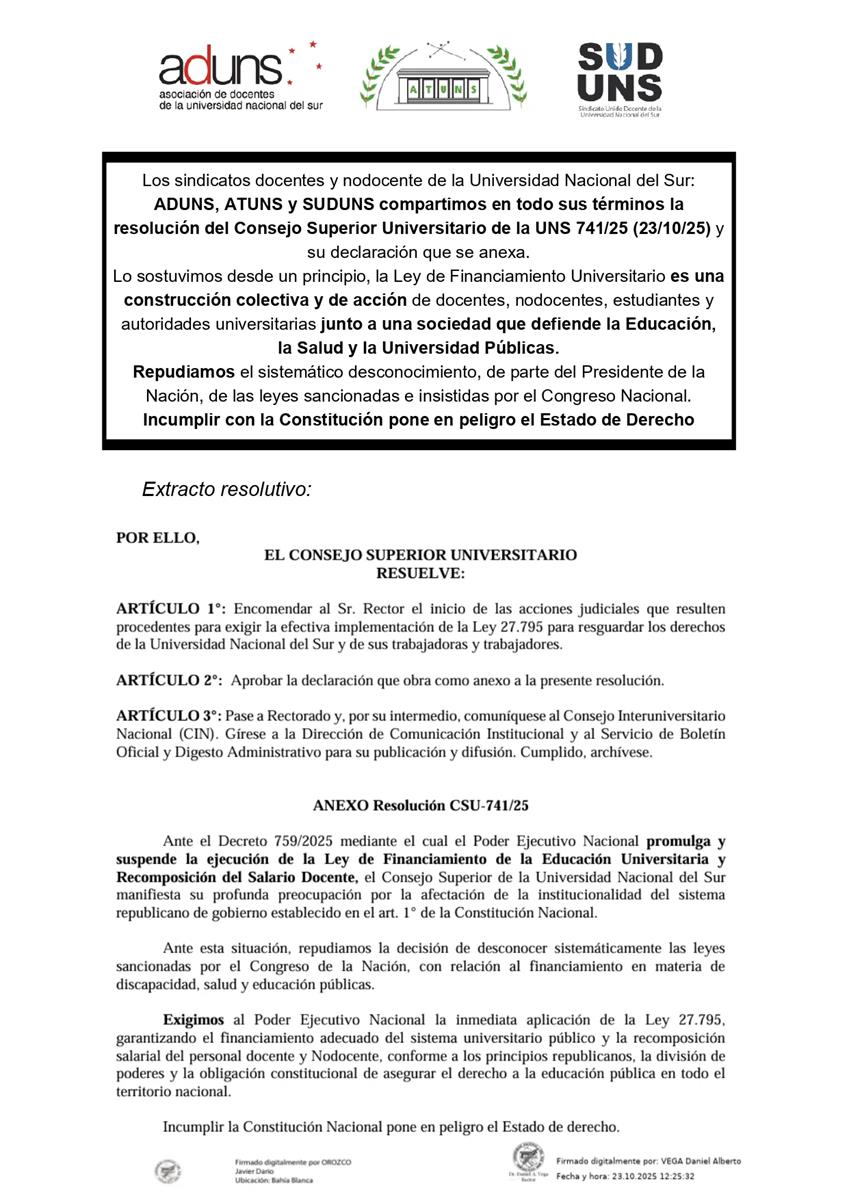 En la primera resolución, encomienda a la máxima autoridad a “iniciar acciones judiciales que resulten procedentes para exigir la efectiva implementación de la ley 27.795 para resguardar los derechos de la Universidad Nacional del Sur y de sus trabajadores”.