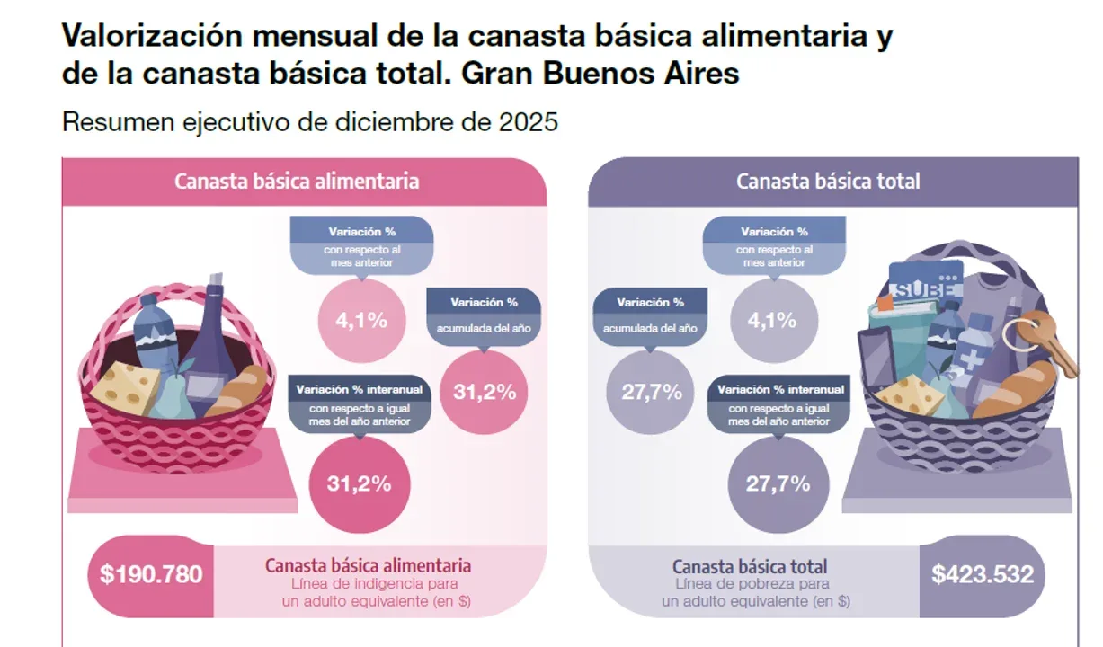 En tanto, la canasta alimentaria, que sirve para estima la indigencia, también se elevó 4,1% y acumuló un alza del 31% en el 2025.