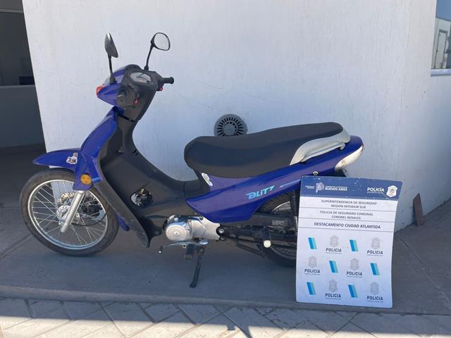 Policías del Destacamento Ciudad Atlántida en el momentos que realizaban recorridas por su jurisdicción observan en calle Gral Paz 930 una moto 110 CC color Azul marca Blitz sobre la vereda.
