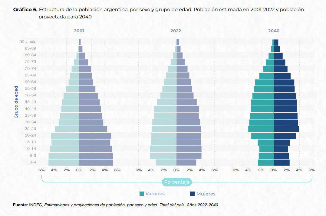 El dato más contundente es el avance de la población de 65 años y más. En 2010 representaban el 10,6% de los habitantes, en 2022 llegaron al 12%, y para 2040 se proyecta que alcanzarán el 16,4% del total. Es decir, casi uno de cada seis argentinos será mayor. Las pirámides poblacionales muestran con claridad este proceso: la cúspide se ensancha y la base se estrecha, señal de que los nacimientos ya no compensan el envejecimiento.
