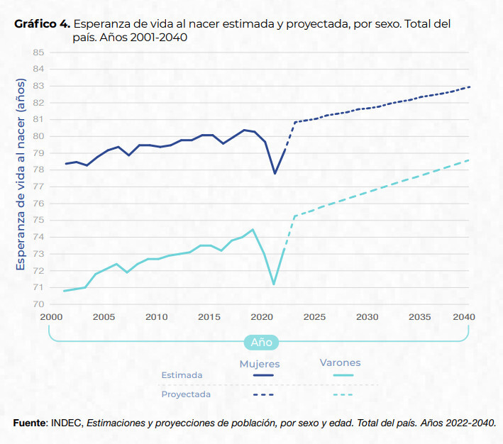 Otro de los motores del envejecimiento es el aumento de la esperanza de vida. Desde 1950 la tendencia es ascendente, interrumpida únicamente por el golpe de la pandemia de COVID-19. Según el Indec, la recuperación ya está en marcha y para 2040 la esperanza de vida al nacer llegaría a 78,7 años en varones y 83 años en mujeres. Además, la brecha entre sexos se achicará: será de 4,3 años, frente a los 5,4 previstos para 2025. Vivir más es un logro, pero también exige repensar el sistema previsional y el modelo de cuidados de largo plazo.