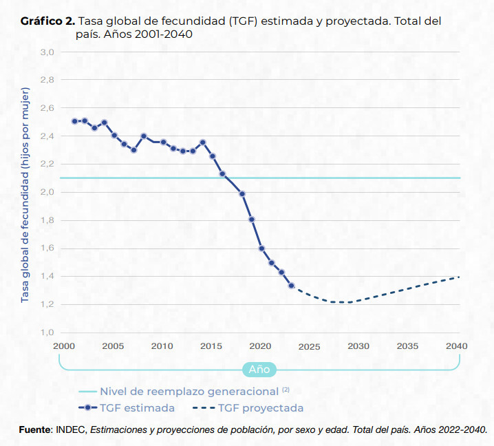 A la vez, la población argentina crecerá mucho más lento que en el pasado. Entre 2001 y 2020, el país sumó habitantes a un ritmo de 1,06% anual. Sin embargo, entre 2022 y 2040 el crecimiento será casi nulo: solo 0,16% por año. La razón principal es la caída abrupta de la fecundidad. Durante dos décadas, la tasa global de fecundidad se mantuvo estable en torno a 2,4 hijos por mujer, pero desde 2015 inició un descenso pronunciado: bajó a 2,1 en 2017 y se desplomó a 1,4 en 2022, por debajo del nivel de reemplazo generacional (2,1).
