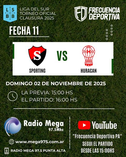 La programación del futbol Primera División de la Liga del Sur continúa este domingo, el puntero Huracán visitará a Sporting en el estadio Mendizábal sin público, será transmisión por Radio Mega con previa desde la hora 15 con el equipo de Frecuencia Deportiva.