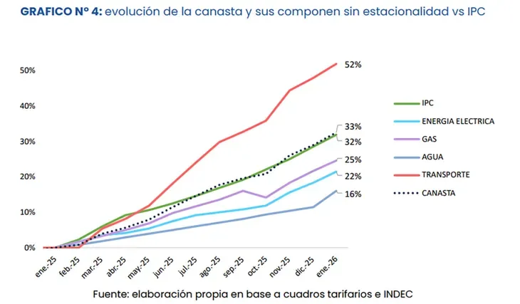 En la comparación interanual, el aumento total de la canasta fue del 33%, apenas 1,5 puntos porcentuales por encima de la inflación minorista de 2025. El mayor ajuste se dio en transporte, con una suba del 52%, seguido por gas (29%), electricidad (21%) y agua (16%).