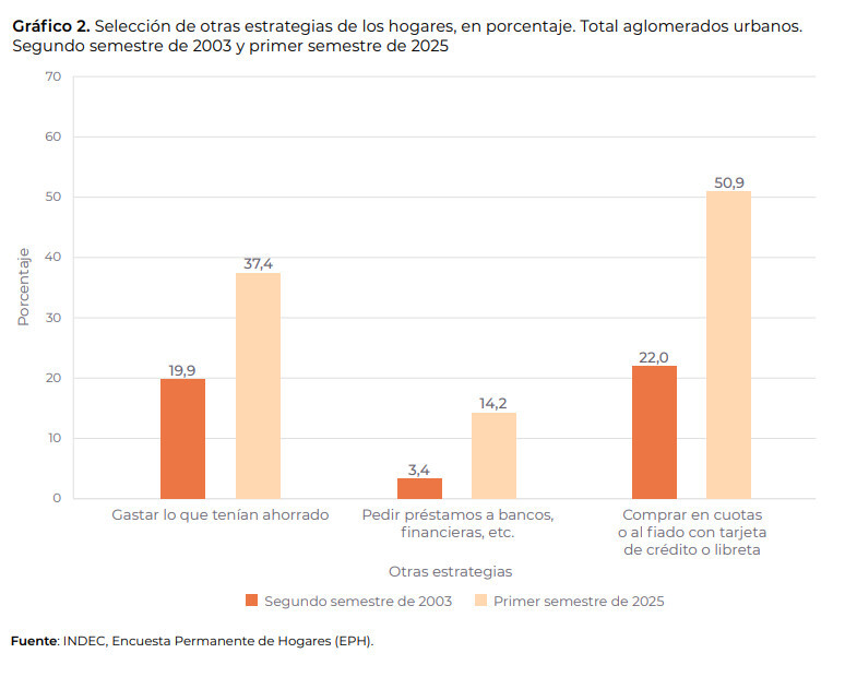 El cambio más drástico se registró en las estrategias relacionadas con el financiamiento y la descapitalización. Comprar en cuotas o al fiado, una práctica extendida en todas las clases sociales, pasó del 22% en 2003 al 50,9% en 2025. Esta es la variación más grande de todo el informe y refleja una fuerte dependencia del crédito para gastos cotidianos.