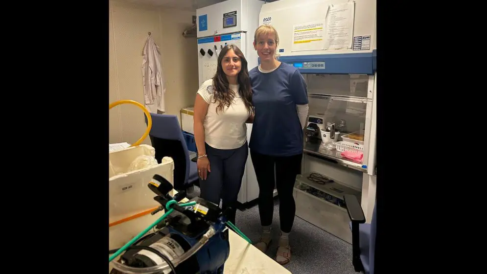Valeria Guinder es investigadora independiente del CONICET en el Instituto Argentino de Oceanografía (IADO, CONICET-UNS) y junto a la becaria doctoral Azul Gilabert, integran el equipo científico de la expedición a bordo del buque de investigación Falkor (too), del Schmidt Ocean Institute, SOI (EE.UU.).
